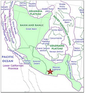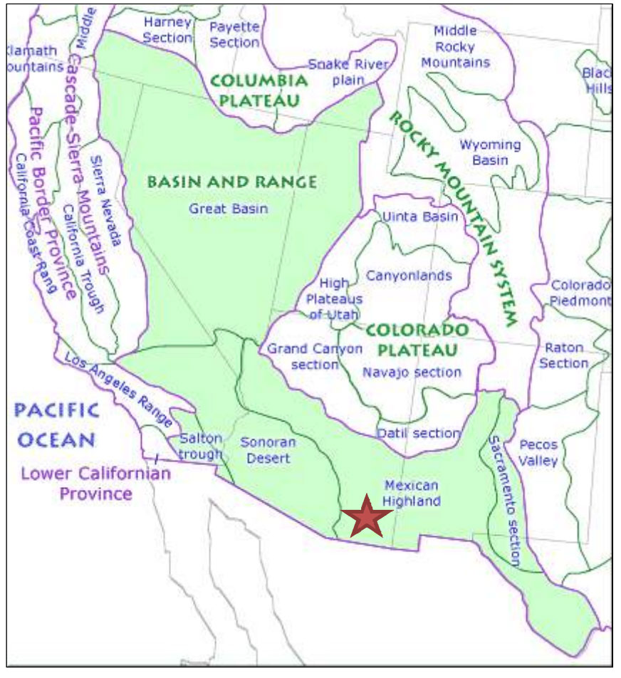 Location of the Basin and Range physiographic domain and five subdomains, from www.geomaps.wr.usgs.gov/parks/province. 2014. Red star marks Mexican Hat location.